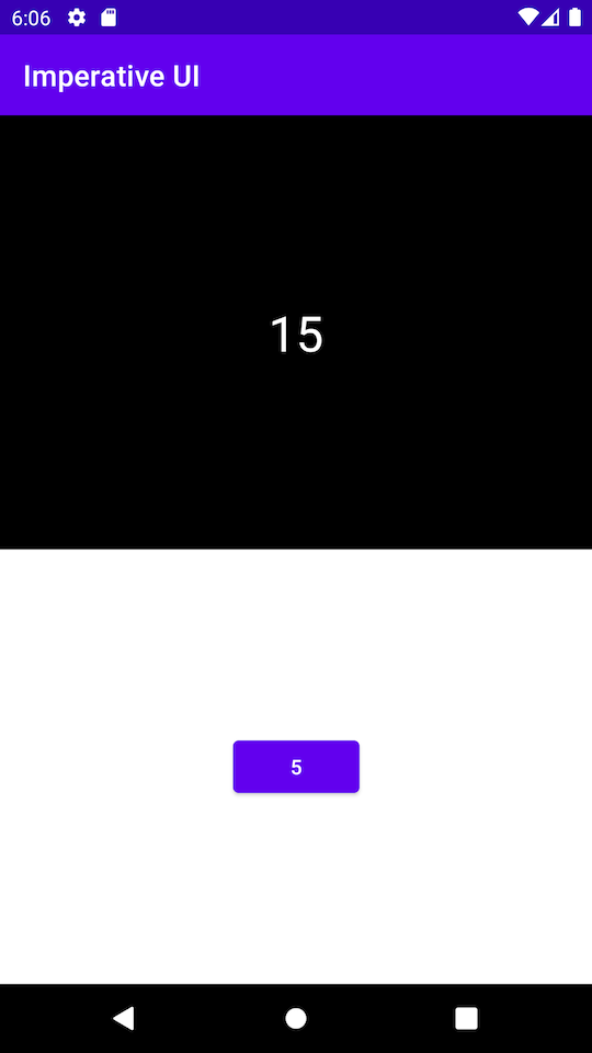 우선 setContentView를 통해 XML 파일(activity_main.xml)에 접근함으로써 소스코드와 UI를 연결합니다. 그리고 findViewById를 통해 UI 객체를 변수에 연결합니다. 위에서는 text와 button 변수에 각각 viewA의 text와 viewB의 button이 연결되었습니다. setOnClickListener를 통해 버튼의 클릭 이벤트가 전달됩니다. 이벤트가 발생했을 때 변경할 상태 변수는 count와 sum으로서 ++count에 의해 값이 증가한 뒤 sum에 더해집니다. 변경된 count와 sum의 값은 각각 text.text와 button.text에 입력됩니다. 그 입력이 바로 명령입니다. text와 button 객체에 값의 반영을 명령한 것입니다. 그것이 바로 명령형 UI 프로그래밍의 방식입니다. 주목할 부분은 text와 button 객체가 앱의 실행부터 종료까지 소멸되지 않고 존속된다는 사실입니다. 그것은 UI 객체가 수시로 생성과 소멸을 반복하는 선언형 UI 프로그래밍과 완전히 다른 점입니다.