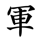 軍(군사 군)은 車(수레 차)와 冖(덮을 멱)을 결합한 회의문자로서 진지 안에 전차가 배치된 모습을 그린 것입니다. 軍이 포함된 단어에는 군대(軍隊), 군사(軍事), 육군(陸軍) 등이 있습니다.
