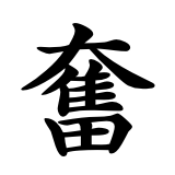 奮(떨칠 분)은 大(큰 대), 隹(새 추), 田(밭 전)을 결합한 회의문자로서 품 안에 있는 새가 밭으로 돌아가기 위해 발버둥치는 모습을 그려 원래 ‘날갯짓을 하다’를 의미했습니다. 奮이 포함된 단어에는 분발(奮發), 흥분(興奮) 등이 있습니다.